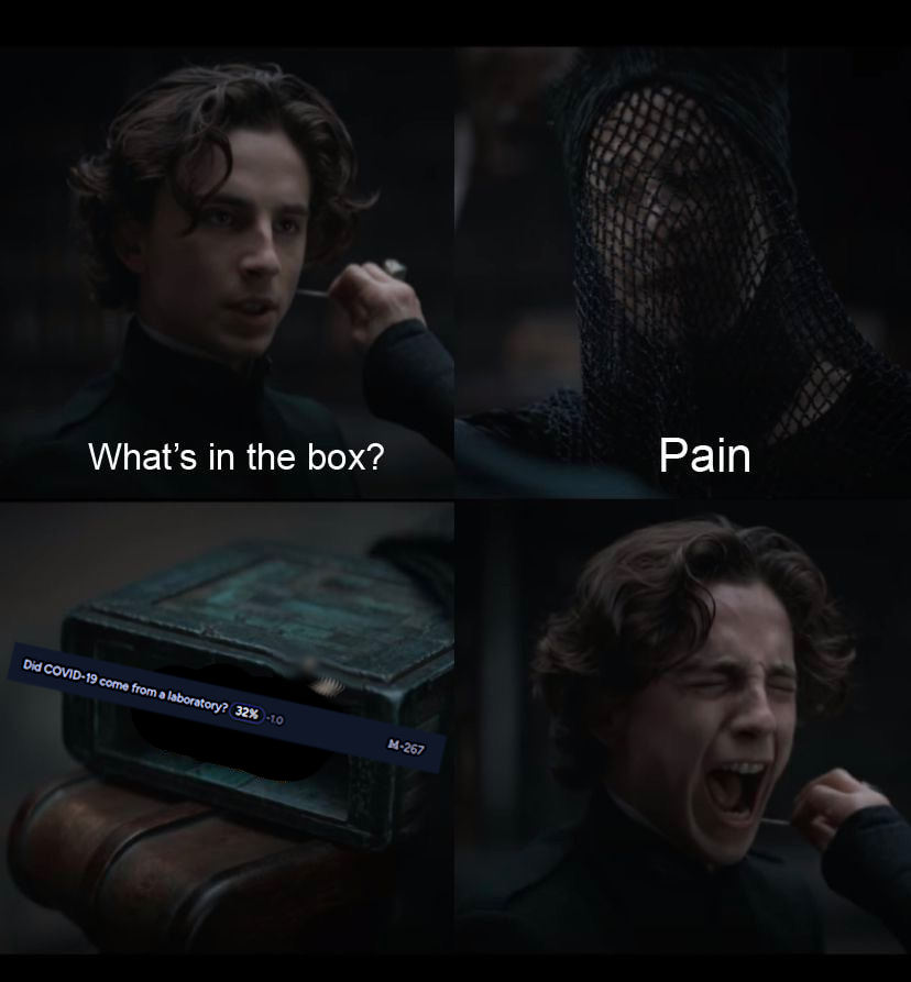 @MachiNi I'm talking about the debate regarding the cause, not the pandemic itself. Unless you believe that the virus was intentionally and maliciously leaked, this debate would seem to be technical in nature, and I would expect it to only really concern people in the scientific community. But for some reason millions of people have taken this as a cause celebre.